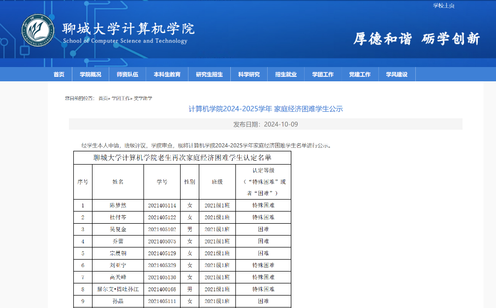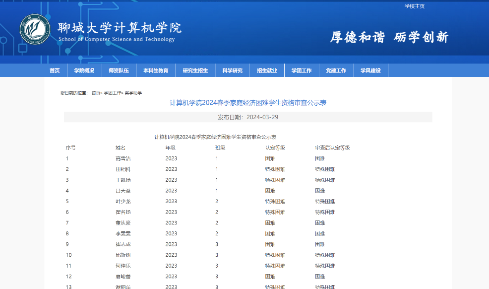 根据学校对困难学生定期进行资格审查的要求,2024年3月对我院2020、2021、2022、2023级困难学生中开展资格审查、调整工作,并予以公示。